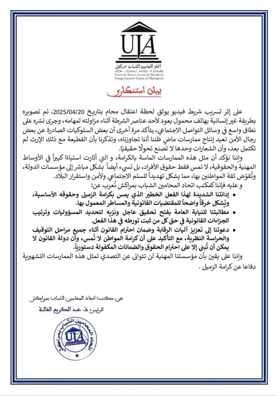 أصدر اتحاد المحامين الشباب بمراكش بيانًا استنكاريًا شديد اللهجة عقب تداول مقطع فيديو يوثق لحظة اعتقال أحد المحامين وهو في حالة سكر، بتاريخ 20 أبريل 2025. واعتبر الاتحاد أن هذا الفعل يُعد انتهاكًا صارخًا للحق في الخصوصية، ومساسًا بكرامة المعني بالأمر، وخرقًا صريحًا لمبدأ قرينة البراءة، المنصوص عليها في الدستور المغربي وفي المواثيق الدولية التي صادقت عليها المملكة.